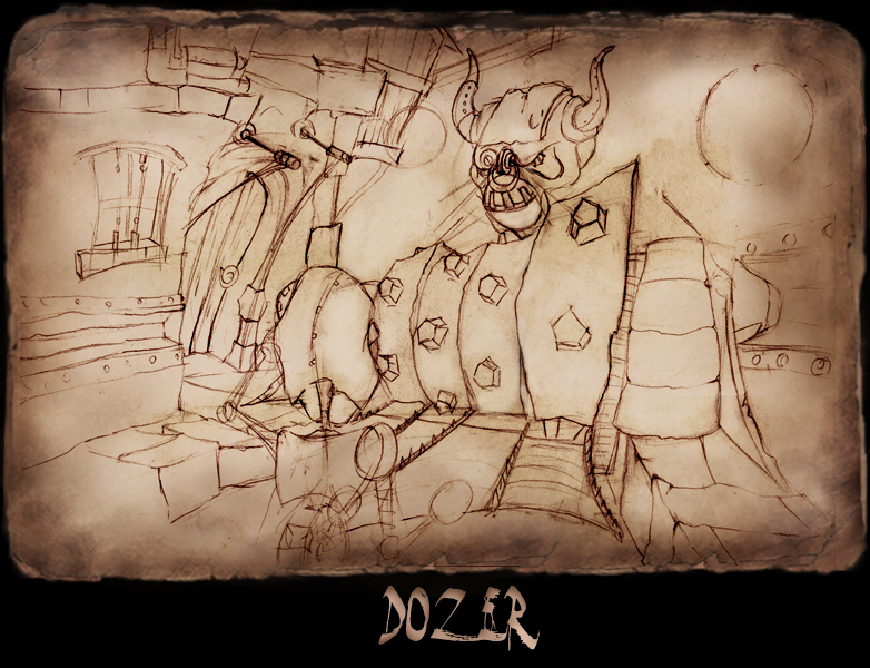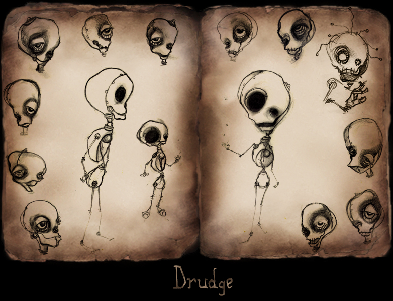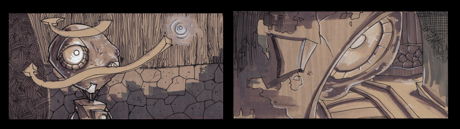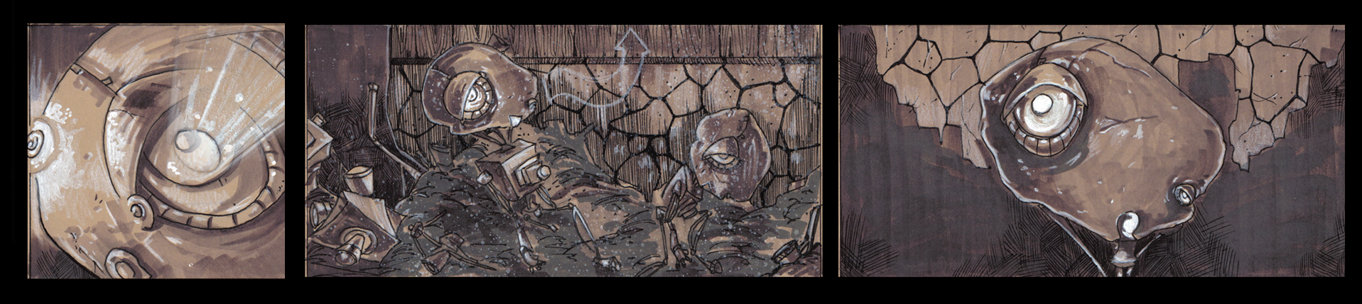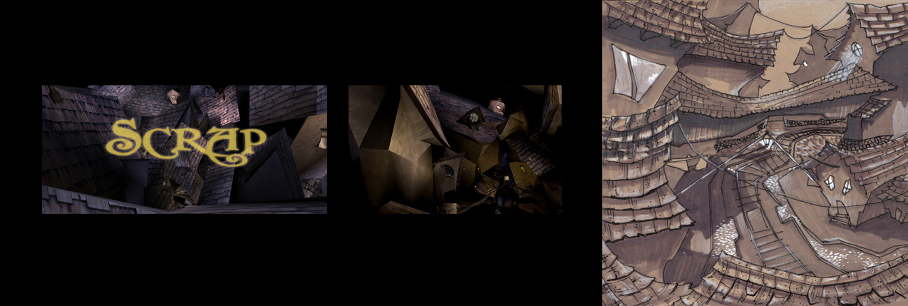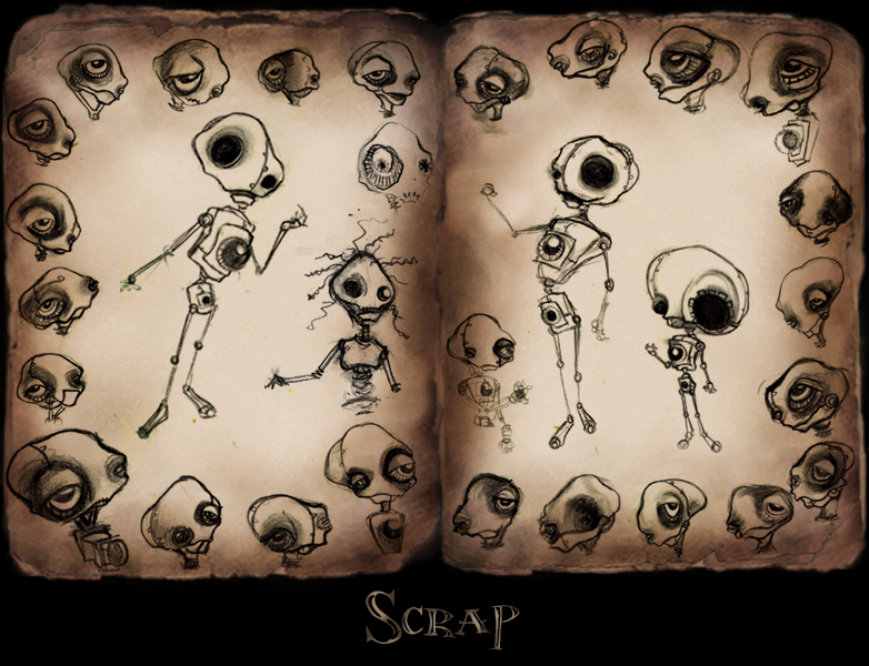 Far off the dense fog dissipates and an industrially skewed dilapidated city resting alone at the edge of the earth clearly emerges. Silhouettes of trash mountains littler the city just above the low lying fog. In the harsh cold world looms a single lustrous firefly cutting through the dark city alleyways. The firefly aimlessly hovers across garbage piles, and lands on a pile of junk it crawls down into a facet of junk, suddenly a beam of light splashes out of the facet and a shield flips over the socket in a blinking gesture. Out of the trash heap emerges Scrap, a childlike creature thrown together with used supplies from a camera repair store.